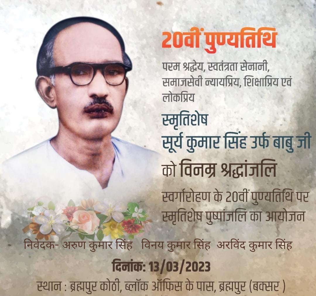 आज महान स्वतंत्रता सेनानी स्वर्गीय सुर्य कुमार सिंह की बीसवीं पुण्य तिथि उनके ब्रह्मपुर स्थित कोठी पर मनाई गई। गांव जवार नगर के प्रबुद्ध नागरिक गण उपस्थित होकर उनके व्यक्तित्व एवं कृतित्व की चर्चा कर उनके चित्र पर माल्यार्पण कर श्रद्धा सुमन अर्पित किए। बाबू सुर्य कुमार सिंह युवा अवस्था में ही स्वतंत्रता के लड़ाई में शामिल हो गए थे और बाद में समाज सेवा में लग गए।