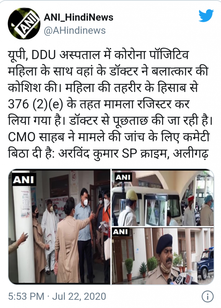 अलीगढ़ के दीनदयाल उपाध्याय अस्पताल में 19 जुलाई को एक युवती कोरोना पॉजिटिव होने के बाद भर्ती हुई थी। 28 साल की एक युवती ने एक डॉक्टर पर शारीरिक छेड़छाड़ और रेप की कोशिश करने का आरोप लगाया है। युवती ने शिकायत दर्ज कराई है कि एक डॉक्टर ने उसके साथ रात में बलात्कार करने की कोशिश की।