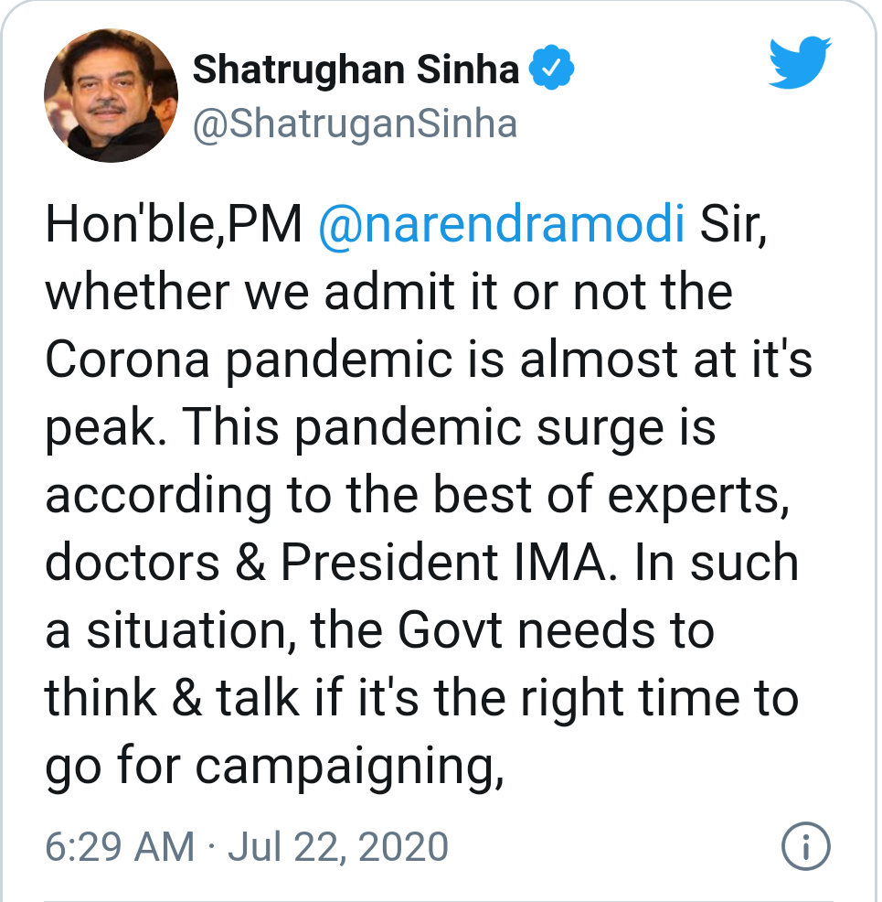 कांग्रेस के नेता शत्रुघ्न सिन्हा ने ट्वीट कर कहा कि “नरेंद्र मोदी सर हम इसे स्वीकार करें या ना करें! कोरोना महामारी लगभग चरम पर है! विशेषज्ञों, डॉक्टरों और आईएमए के सर्वोत्तम अध्यक्ष के अनुसार है यह महामारी बढ़ रही है! सरकार को चुनाव प्रचार के लिए जाने का सही समय सोचने और बात करने की जरूरत है!”