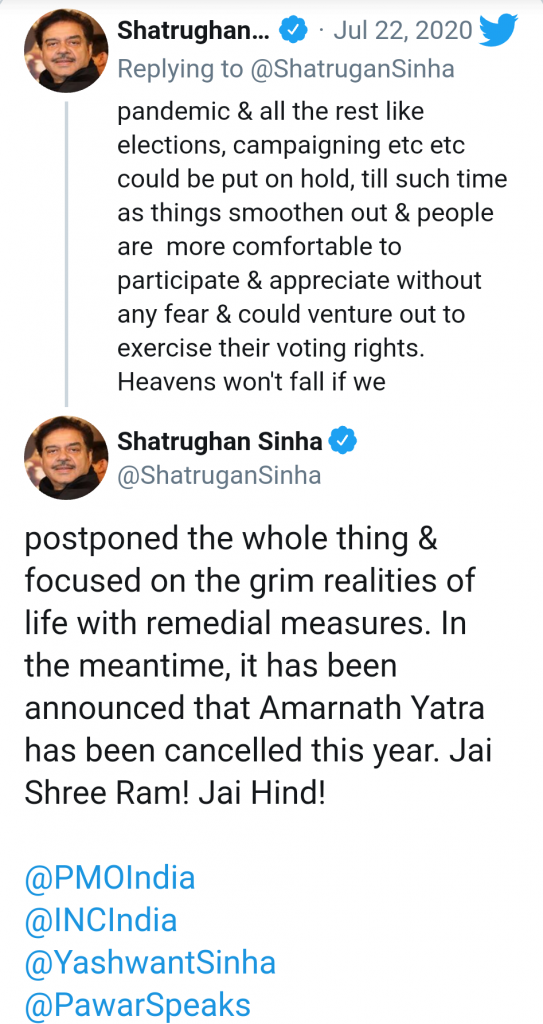 इतना ही नहीं बल्कि शत्रुघ्न सिन्हा ने एक और ट्वीट किया और कहा कि “सभी चीजों को स्थगित कर दिया जाए और जीवन की गंभीर वास्तविकताओं पर ध्यान केंद्रित किया जाए! इस बीच, यह घोषणा की गई है कि अमरनाथ यात्रा इस साल रद्द कर दी गई है! जय श्री राम! जय हिन्द!”