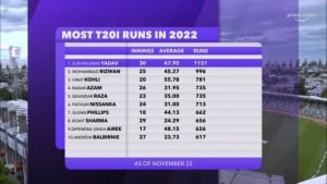 सूर्य कुमार यादव 2022 में सबसे ज्यादा रन बनाने वाला बल्लेबाज बन गया है । कुल इस वर्ष के 31 मैचों में 1164 रन बनाए हैं सूर्य कुमार यादव जिसमे अर्द्धशतकों की संख्या 50 तो शतक भी 2 लगाएं है। इन्हे 360 डिग्री वाला खिलाड़ी कहा जा रहा है इस प्रकार का बलेबाज अभी भारत में नहीं हुए थे जिस कमी को भारतीय टीम की थी जिसे सूर्य के कलाई नर पूरा किया।