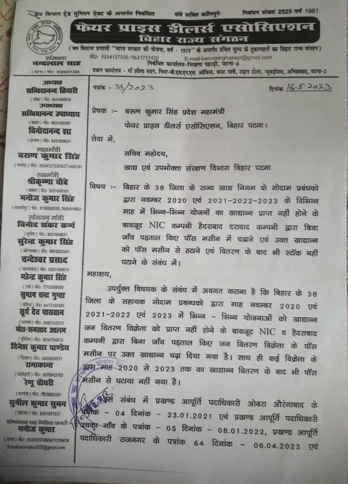 पटना : फेयर प्राइस डीलर्स एसोसिएशन के प्रदेश महामंत्री बरूण कुमार सिंह व खाद्य एवं उपभोक्ता संरक्षण विभाग के सचिव विनय कुमार जी के कार्यालय कक्ष मे दिनांक 20-5-2023 को हुए वार्ता हुई एवं आश्वासन मिला एवं हस्तगत कराए गए आवेदन पत्र पर विभाग सचिव से हुई वार्ता के वाद दिए गए आश्वासन का असर दिखने लगा है जिसमे जून – जुलाई 2023 मे अतिरिक्त आवंटन की माँग की गई है ।