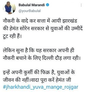 झारखंड भाजपा विधायक दल के नेता बाबूलाल माराडी ने झारखंड सरकार पर जोरदार हमला बोला है उनहोंने कहा की ” नौकरी के वादे कर सत्ता में आयी झारखंड की हेमंत सोरेन सरकार से युवाओं की उम्मीद टुट रहीं है ।